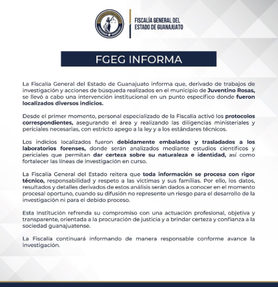 “La Fiscalía General del Estado reitera que toda información se procesa con rigor técnico, responsabilidad y respeto a las víctimas y sus familias. Por ello, los datos, resultados y detalles derivados de estos análisis serán dados a conocer en el momento procesal oportuno, cuando su difusión no represente un riesgo para el desarrollo de la investigación ni para el debido proceso”.